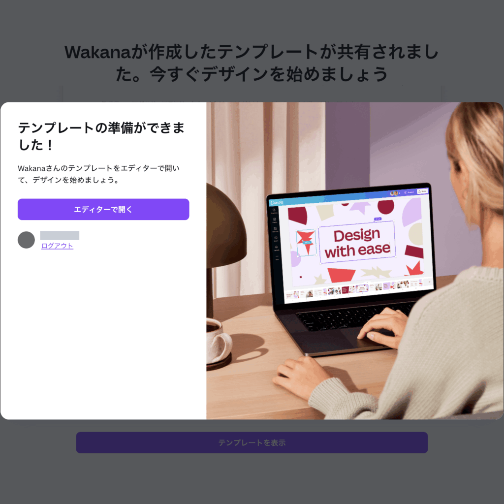 「テンプレートを表示」のボタン→「エディターで開く」を押すと、Canvaの編集画面に移動し、編集ができるようになります。