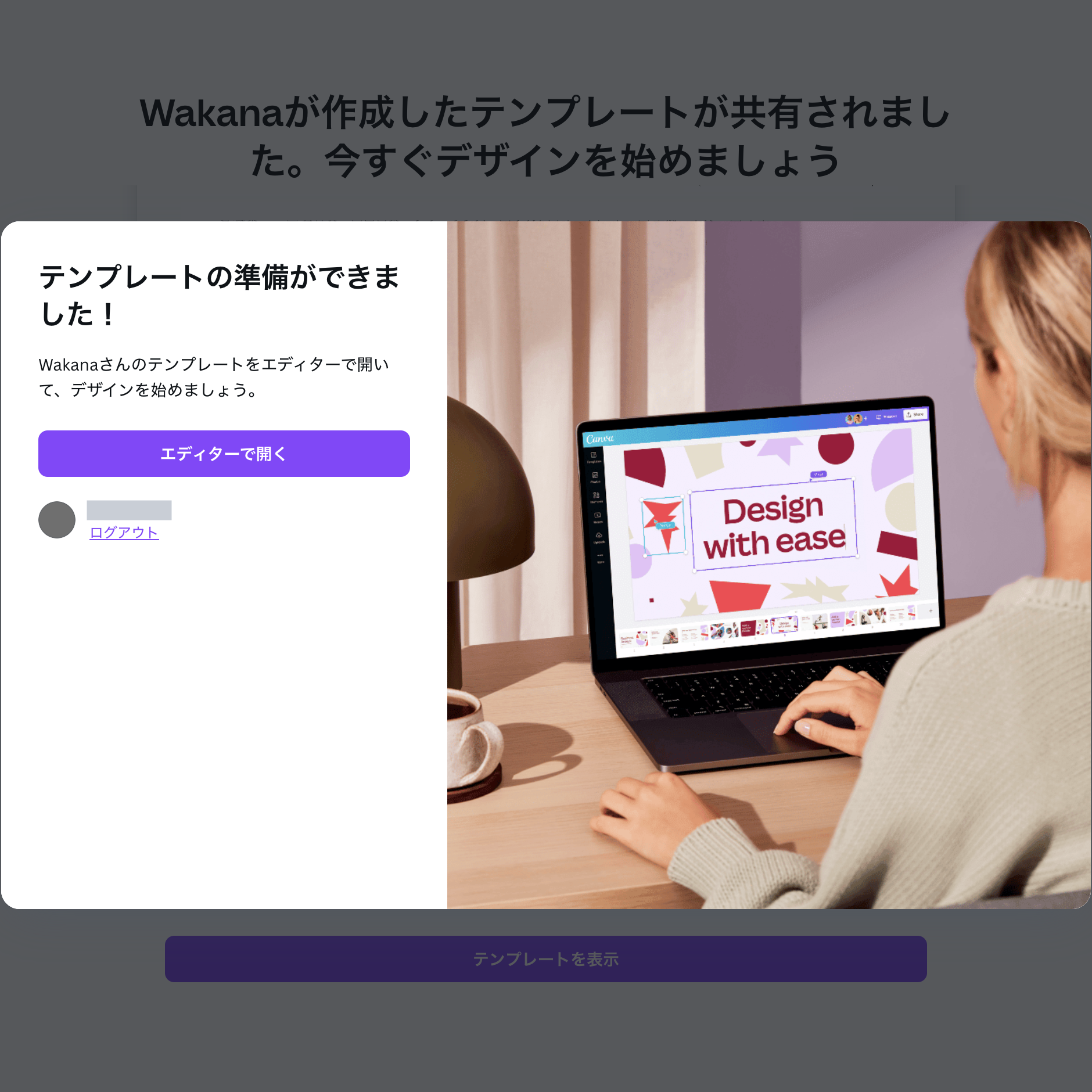 - 「テンプレートの準備ができました」の画面が表示された場合、紫色のボタンを押すと、Canvaの編集画面に移動し、編集ができるようになります。