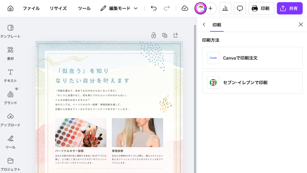 編集画面からそのままコンビニプリントをしたり、印刷の注文も簡単にできますよ!